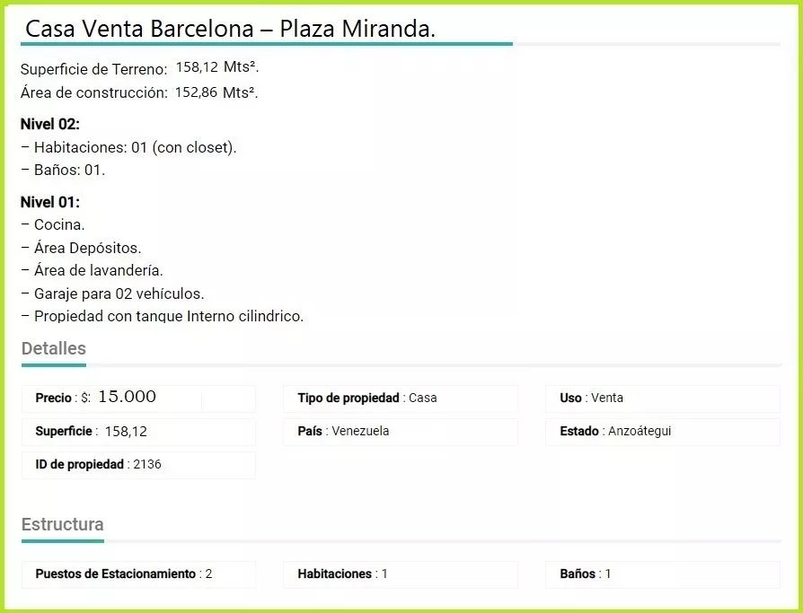 Casa Venta Barcelona Plaza Miranda SOLO CLIENTES. - Sujeys Ortiz Evergreen.Superficie de Terreno: 158,12 Mtrs2.Área de construcción: 152,86 Mtrs2.Nivel 02:- Habitaciones 01 (Con Closet),- Baños: 01.Nivel 01:- Cocina.- Área Depósitos.- Área de lavandería.- Garaje para 02 vehículos.- Propiedad con tanque interno cilíndrico.Para más información puede contactar:Sujeys Ortiz - Asesor inmobiliario:+58 4121921043 +58 4147810639Evergreen Inmobiliaria C.A"Obtén lo que soñaste"